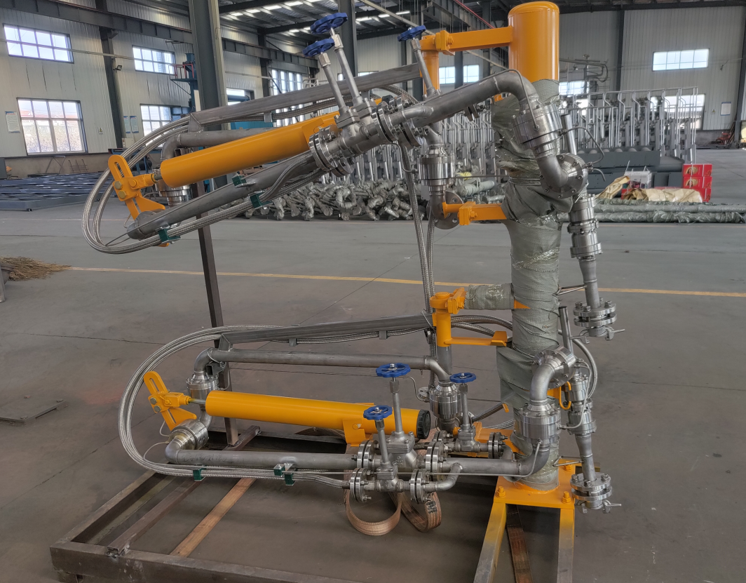 LNG、乙烯裝卸車臂的主要功能用于在罐車和管線間建立通道,完成主要的裝卸車功能;另外與回收裝置相聯,用于平衡罐車內壓力。低溫裝車臂主要分為氣相和液相兩條臂,兩條臂共同裝在一個立柱上。實現低溫介質的裝卸車和回氣補氣,每個獨立的裝卸臂分為內臂、外臂及和槽車連接的前部外伸臂。在裝卸臂的外臂上一般設立用于主管線關斷的球閥及在兩邊用于氮氣置換的旁路球閥,外臂有一彈簧平衡系統用來平衡外臂、外伸臂的重量,便于操作裝車。